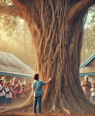 في إحدى القرى الصغيرة، كانت هناك شجرة ضخمة في ساحة المدرسة، عمرها مئات السنين. كانت أغصانها تمتد كالمظلة، توفر الظل للأطفال في الصيف، وتتحمل الرياح القوية في الشتاء.